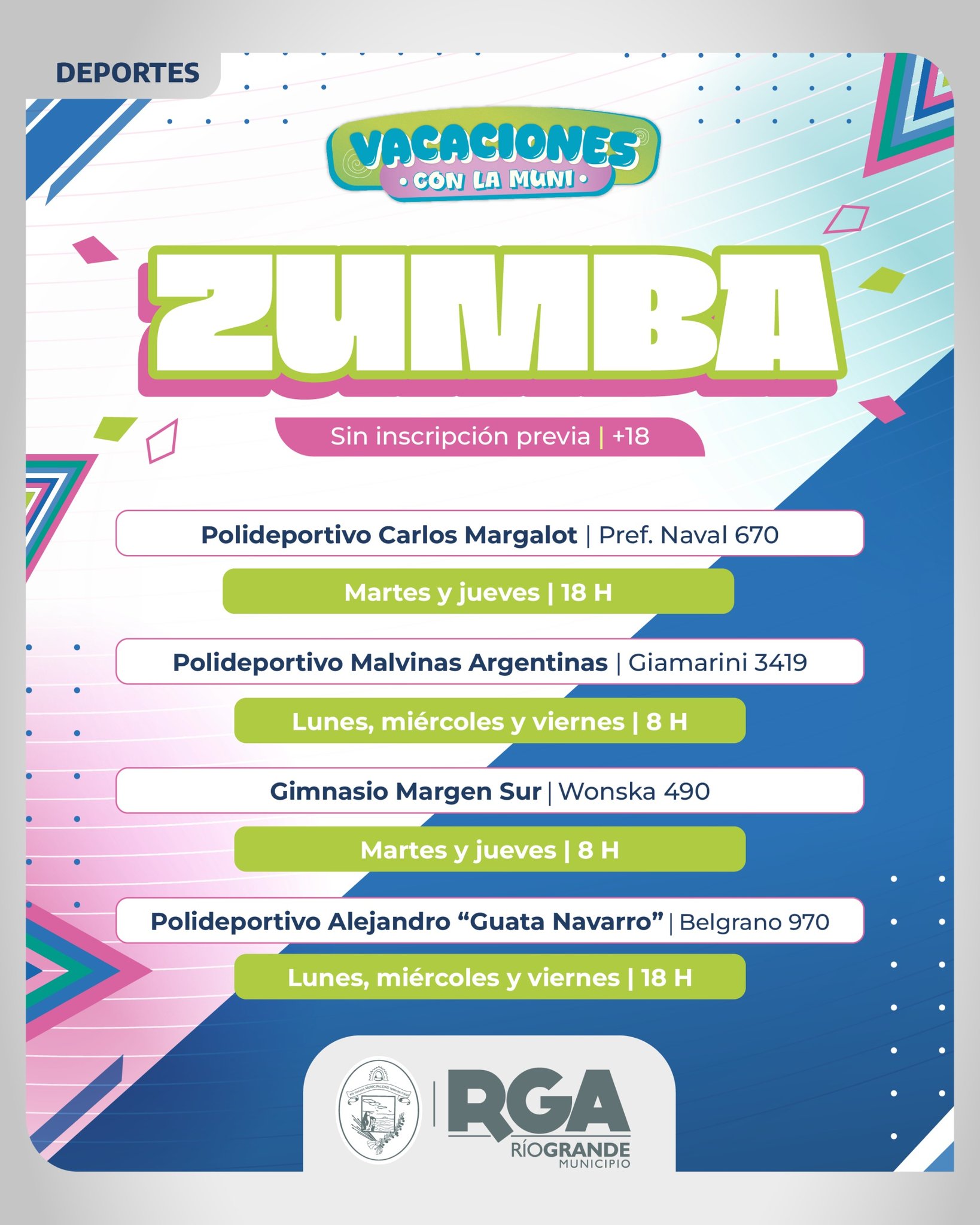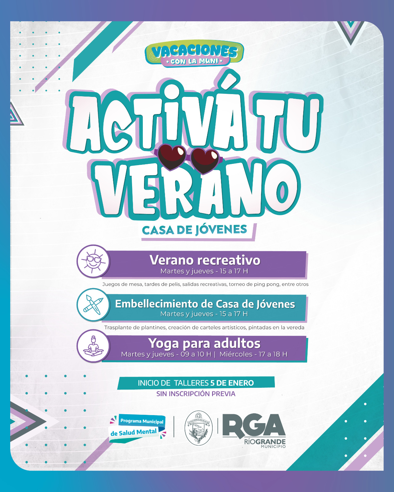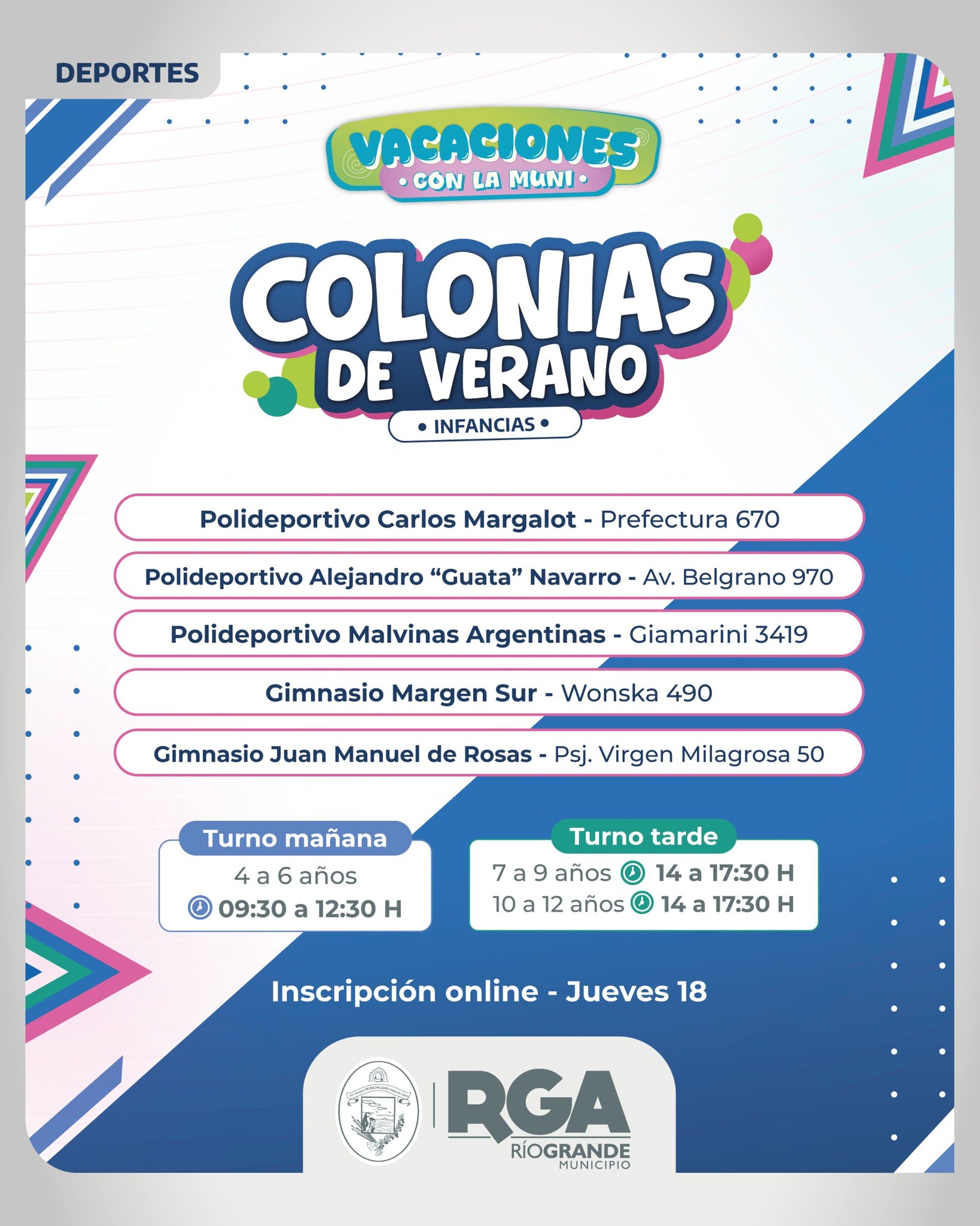 VUELVEN LAS COLONIAS DE LA MUNI Inscripción: desde el jueves 18 de diciembre a las 10:00 H Inicio: lunes 5 de enero Infancias: Horarios: - 09:30 a 12:30 | Grupo de 4 a 6 años - 14:00 a 17:30 | Grupos de 7 a 9 años y de 10 a 12 años - 14.00 a […]